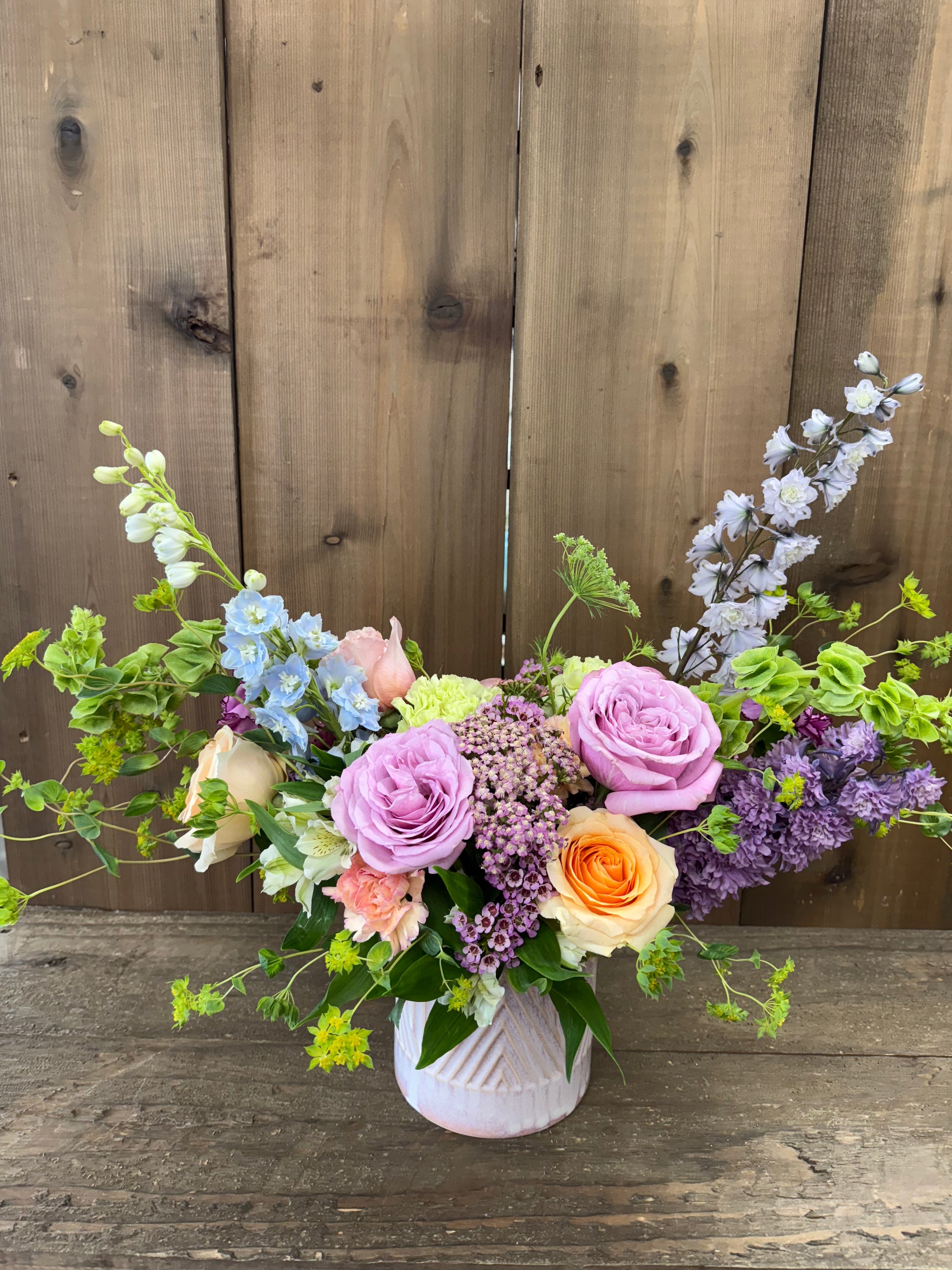 At Wild Iris, every arrangement is thoughtfully crafted with care, creativity, and seasonally available blooms. While the photos you see represent the overall spirit, style, and color palette of each design, the exact flowers—or one-of-a-kind vessels—may vary depending on seasonal availability and what’s freshest in our cooler.