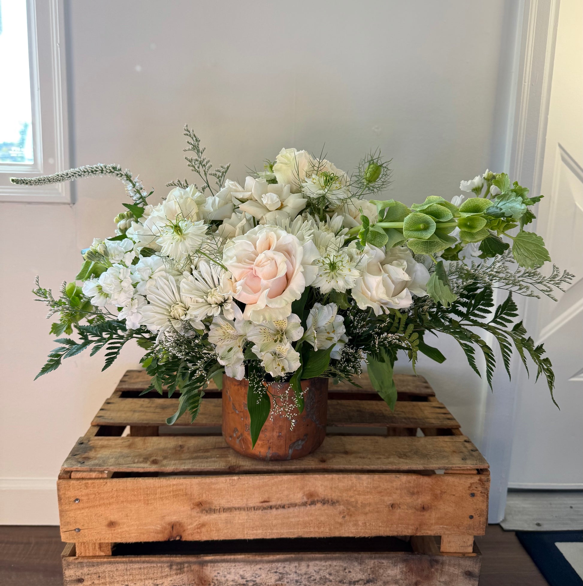 This is a 360-degree arrangement, thoughtfully designed to look beautiful from every angle. The color palette is a soft blend of white and cream blooms, creating a feeling of timeless beauty with just the right amount of grace. It’s arranged in a low, hammered metal pot — rustic, textural, and full of character.