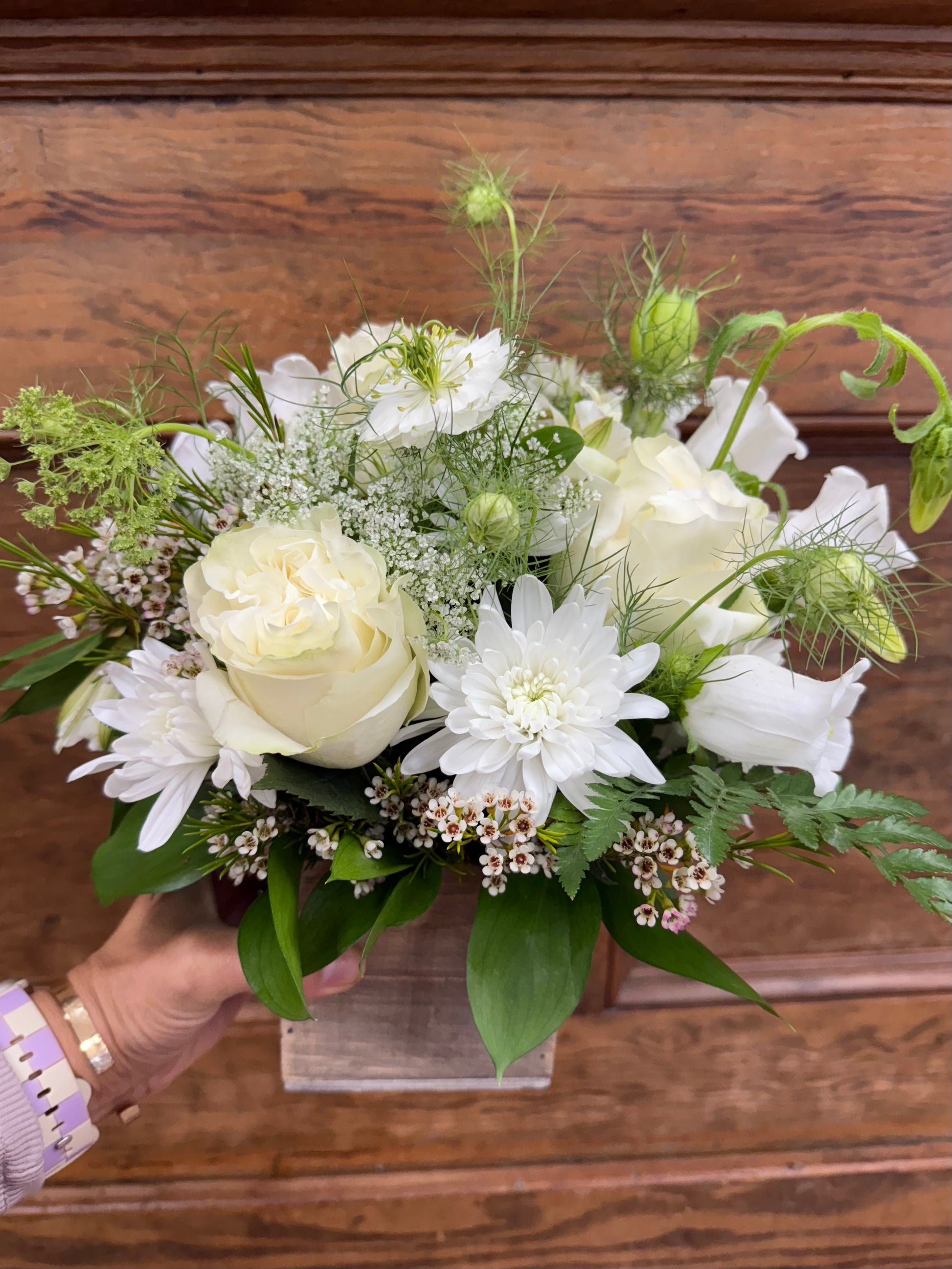 Soft as morning light and rooted in something real, Dust & Dawn is a 360-degree arrangement designed in a rustic brown wooden cube with a natural finish and plastic liner. Filled with blooms in creamy whites and warm neutrals, it balances rugged charm with quiet elegance — like a calm prairie morning caught in full bloom.